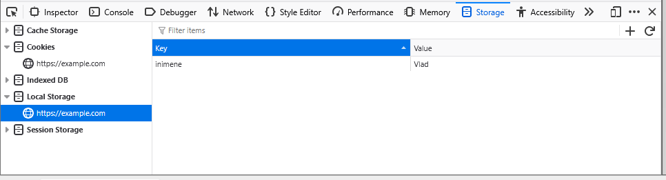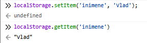 Salvestan localStorage’isse paar võti-väärtust võtme ’inimene’ ja väärtusega ‘Vlad’. Saan väärtuse võtme ’inimene’ järgi.